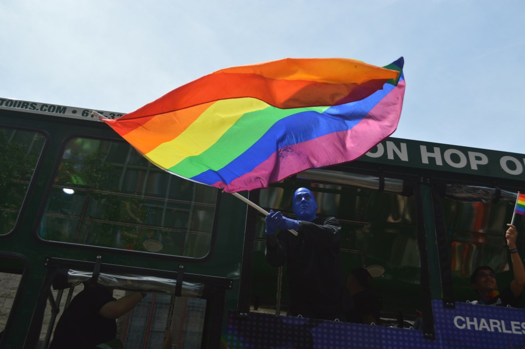 A member of the blue man entourage waves a rainbow flag during the 2018 Pride Parade